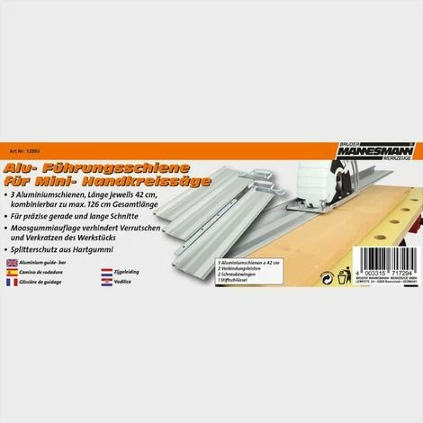Die perfekte Kombination von Gerät und Führungsschienen sorgt dafür, dass Sie lange gerade Schnitte mit hoher Präzision ausführen können. Dieses Set ist geeignet für die Mini-Handkreissäge von Brüder Mannesmann, die Sie in unserem Webshop finden.