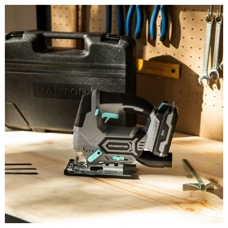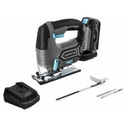 Sierra de calar sin cables, con batería de 20 V y 2000 mAh, velocidad sin carga de 2700 rpm, profundidad de corte de 80 mm en madera, de 12 mm en aluminio y de 5 mm en metal; longitud de carrera de 20 mm, ángulo de ajuste de ± 45º, luz de trabajo LED incorporada y autonomía de hasta 20 minutos.