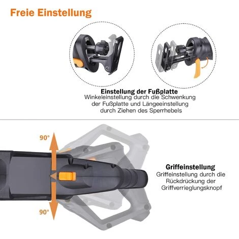 DrehgriffDrehgriff ermöglicht das Drehen um 90 ° nach links oder rechts, drei Positionen für bündiges Schneiden und erhöhte Flexibilität. | Einstellbare Schuhlänge und -winkelEinstellbare Schuhlänge / -winkel machen es bequem, unterschiedliche Schneidlängen und -winkel zu haben. | 2 LED-LichterEingebaute 2 LED-Arbeitsscheinwerfer sorgen für eine klare Sicht bei schlechten Lichtverhältnissen. |