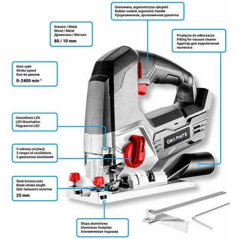 Die präzise Akku-Stichsäge ist kompatibel mit 18V Li-Ion Energy + Batterien und lässt sich dadurch auch ohne Zugang zu Steckdosen betreiben. Das Gerät ist für das präzise und schnelle Schneiden von Holz und Metall mit einer maximalen Dicke von 80 mm bzw. 10 mm ausgelegt. Mit einem Stellrad lassen sich bis zu 2.400 Hübe pro Minute einstellen. Der Neigungswinkel kann um bis zu 45° nach links oder rechts variiert werden und durch einen 3-stufigen Schalter lassen sich Pendelbewegungen einstellen, um die Schnittgeschwindigkeit bei gewissen Materialen zu erhöhen. Das Elektrowerkzeug ist mit einem schlüssellosen Klingenwechselsystem und einer LED-Diode ausgestattet, die den Arbeitsplatz beleuchtet. Das Stichsägeblatt (25 mm Hub) ist mit einer transparenten Abdeckung aus strapazierfähigem Polycarbonat gesichert. Der Werkzeughalter des Geräts wurde für die Arbeit mit T-Sägeblättern angepasst. Der Griff wurde mit einem praktischen Schalter mit Schloss ausgestattet, um ein versehentliches Einschalten zu verhindern. Der gummiüberzogene Griff bietet höchsten Komfort und Sicherheit und ermöglicht eine ruhige Führung, während des Betriebs. Durch ein Abblas- und Staubentfernungssystem werden Arbeitsrückstände direkt von der Oberfläche nach der Bearbeitung so gut es geht entfernt und eine im Lieferumfang enthaltene Parallelführung verhilft zusätzlich zu einer ruhigen Führung.