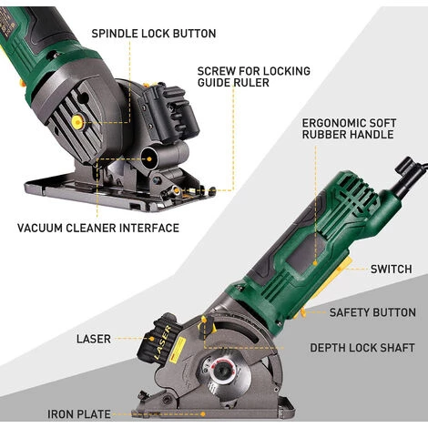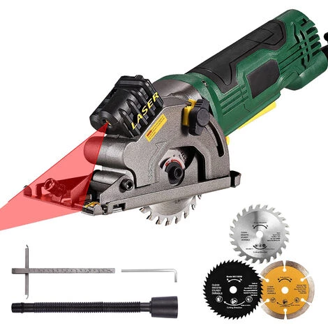 Mini-Kreissäge, 4,8 A Kompakt-Kreissäge, 3700 U/min, mit Laserführung, Skalenlineal, Vakuumanschluss, 3 Klingen zum Schneiden von Holz, Fliesen und Weichmetall. Perfektes Design für kleine Projekte