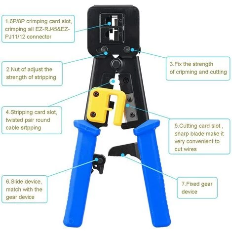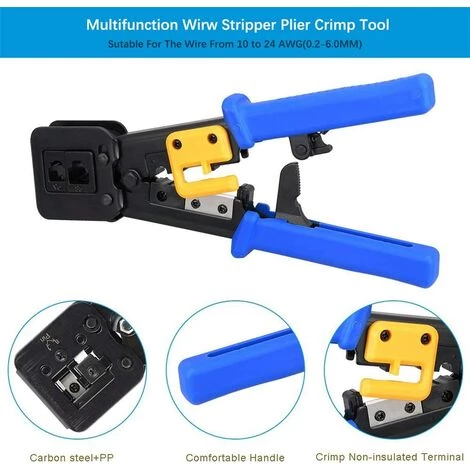 Professionelles RJ45-Crimpwerkzeug – Dies ist ein vielseitiger ez over Ethernet-Crimper für herkömmliche RJ45 / RJ11 / RJ12-Internetanschlüsse, ein modularer RJ45-Crimper für Sprache und Sprachübertragungsanwendungen. Präziser und schneller Betrieb, einfaches Schneiden, Abisolieren und Crimpen.