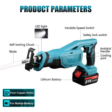 „Dies ist eine Art Qualitäts-Säbelsäge, die einen großen Motor für eine leistungsstarke Steuerung verwendet, die eine stabile Leistungsabgabe liefern kann. Einfache Installation, Sie können Sägebit und Batterie schnell austauschen und ersetzen, ohne Werkzeug zu verwenden. Geeignet zum Schneiden von Holz, Eisen Blech und Kunststoff. Probieren Sie es aus.