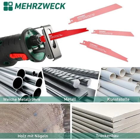 - Nach dem Lösen des Schnappschlosses wird das Sägeblatt automatisch eingeklemmt. Wird mit 3 Klingen für Holz mit Nagel und 3 Klingen für Metall geliefert.