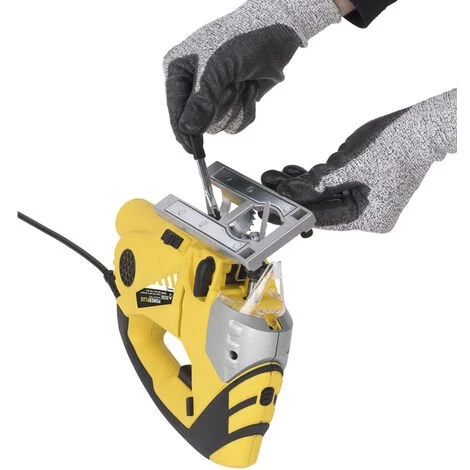 Diese Stichsäge schneidet mühelos durch Holz von einer Dicke bis zu 80 mm, Metall von einer Dicke bis zu 10 mm und weitere Materialien. Dank der LED-Lampe, zum ausführlichen Ausleuchten des Schneidebereichs und dem eingebauten Klasse 2 Laser, gelingen gerade Schnitte ohne Probleme. Bei Gehrungs- und Schrägschnitten kann der Auflageschlitten um bis zu 45 Grad in jede Richtung verstellt werden.