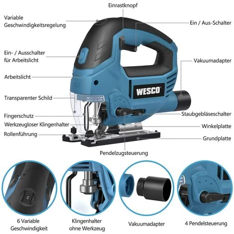 INTELLIGENTES DESIGN Stichsäge – Sicherheitsverriegelungs Schalter gewährleisten um die Sicherheit bei langen Einsätzen. Das Staubgebläse hebt das Sägemehl und den Staub aus dem Schneidbereich. LED-Licht beleuchte des Arbeitsbereichs, die Parallelführung gewährleisten die präzise Schneiden