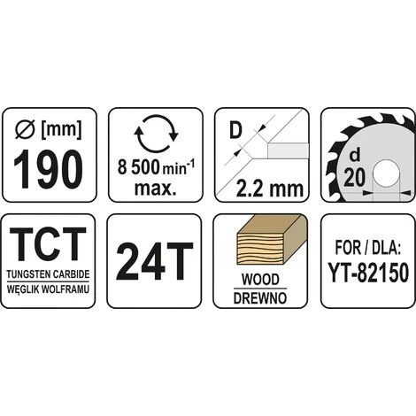 YATO Kreissägeblatt mit 24 Zähnen. Das Kreissägeblatt hat einen Umfang von 190 mm und einen Innendurchmesser von 20 mm. Das Kreissägeblatt ist für eine Kreissäge bestimmt.